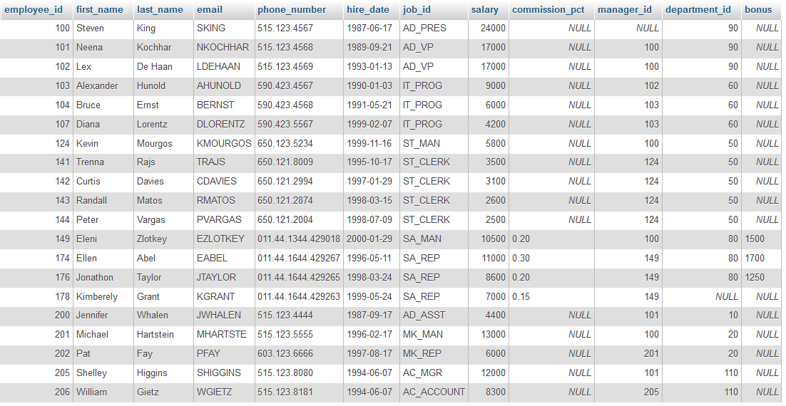 Als je gewend bent te werken met Excel zul je de structuur herkennen. Een Excel werkblad kan verschillende tabbladen hebben met op elk tabblad een tabel. In elke tabel zie je rijen en kolommen met op de bovenste rij de kolomnamen. Hieronder zie je de tabel employees van Oracle in Excel. Je kunt de tabellen in Excel formaat hier downloaden. Ze staan dan bij elkaar op één werkblad. Het is handig een exemplaar op papier te hebben terwijl je met de cursus bezig bent.