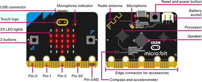 Jouw BBC micro:bit heeft een breed scala aan functies om te verkennen. Lees meer over elk van de genummerde functies hieronder.