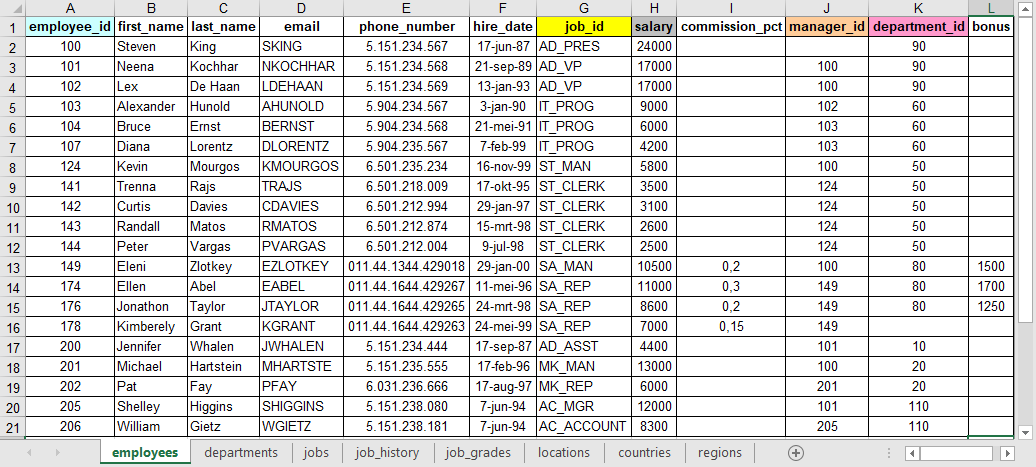 Als je gewend bent te werken met Excel zul je de structuur herkennen. Een Excel werkblad kan verschillende tabbladen hebben met op elk tabblad een tabel. In elke tabel zie je rijen en kolommen met op de bovenste rij de kolomnamen. Hieronder zie je de tabel employees van Oracle in Excel. Je kunt de tabellen in Excel formaat hier downloaden. Ze staan dan bij elkaar op één werkblad. Het is handig een exemplaar op papier te hebben terwijl je met de cursus bezig bent.