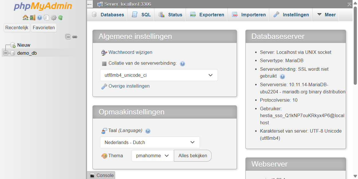 Op de ontwikkelserver draait MariaDB als RDBMS (Relational DataBase Management System). MariaDB is een opensource-fork van MySQL.