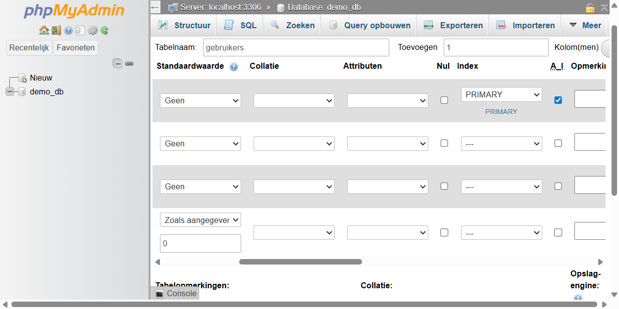 Bij gebruiker_id wordt A_I (Auto Increment) aangevinkt, bij Index verschijnt dan PRIMARY.