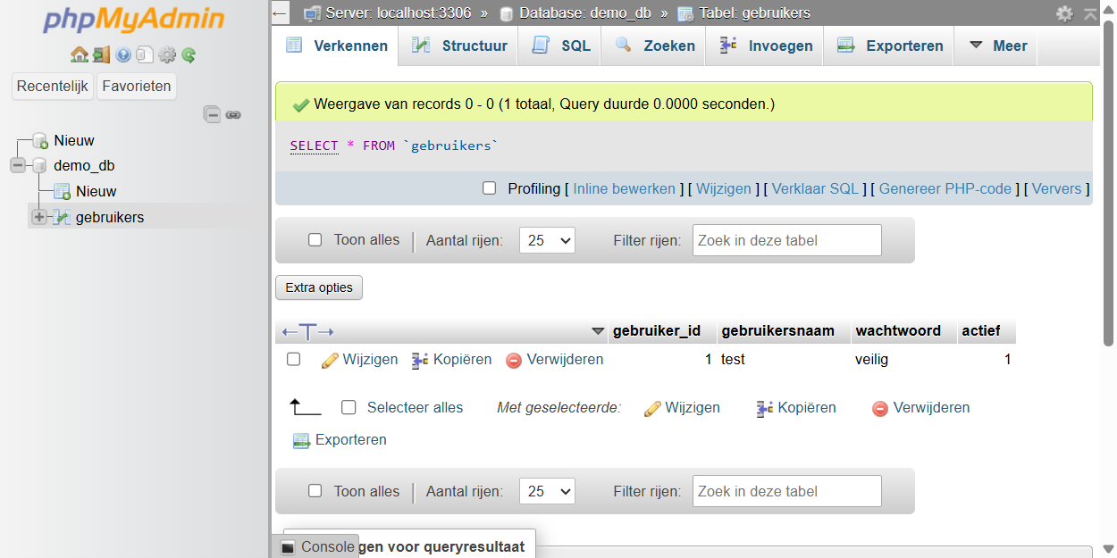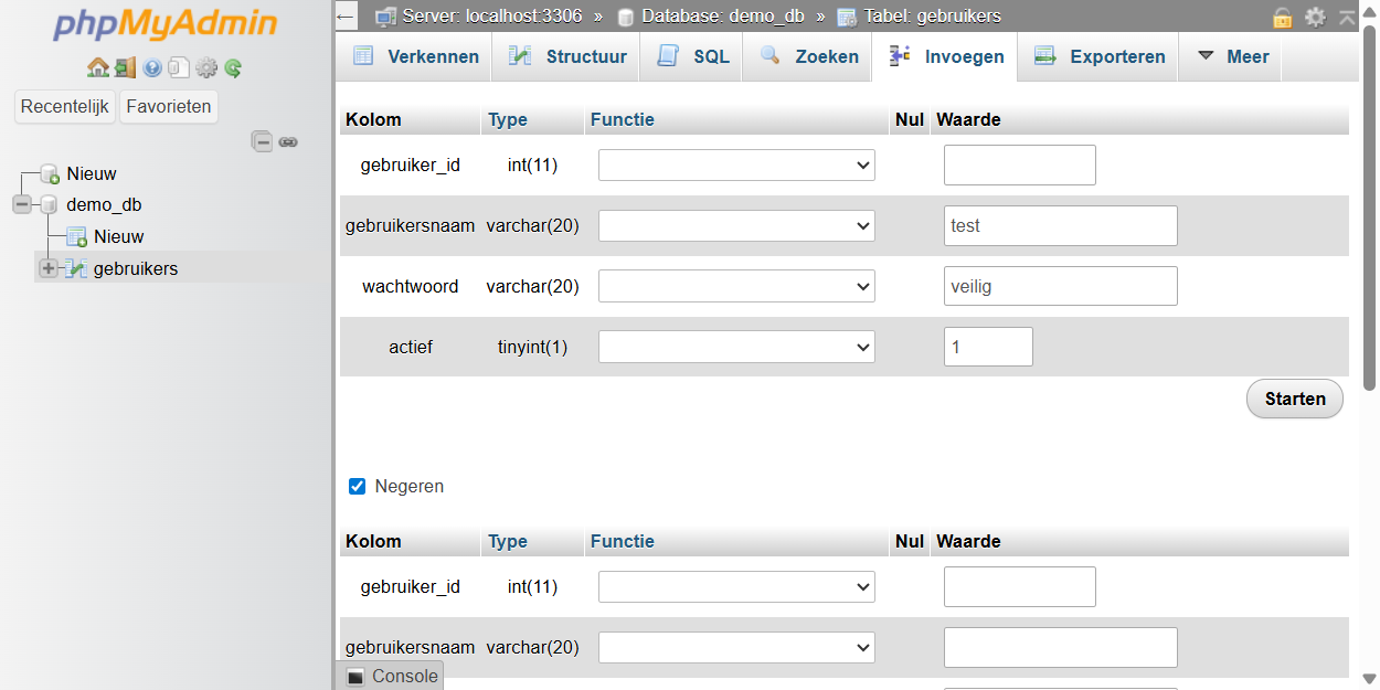 Klik bovenin op Invoegen. Kies een gebruikersnaam en wachtwoord voor je eerste gebruiker en zet actief op 1 (true).