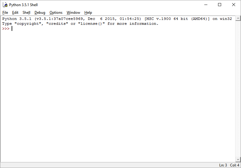 Als je IDLE start, ben je in een zogeheten “Python shell” (zie afbeelding 2.1) Dit is, als het ware, een interactief Python programma, waarin je regels code kunt typen die onmiddellijk worden uitgevoerd als je op Enter drukt. Bijvoorbeeld, als je print(7/4) typt, geeft IDLE meteen als antwoord . Dit is niet de manier waarop je wilt programmeren, maar je kunt wel op deze wijze snel het effect testen van regels Python code.
