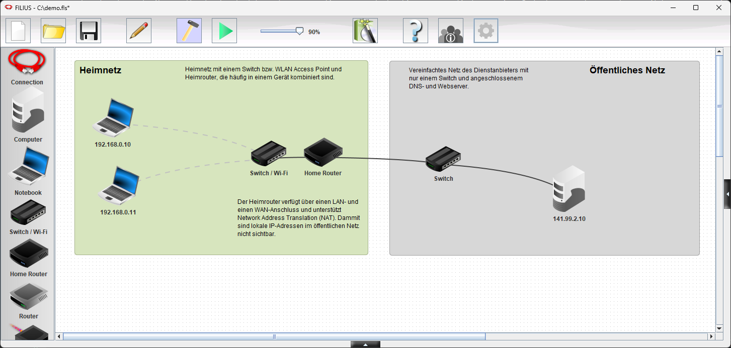 Filius is een educatief programma waarmee je computernetwerken kunt nabouwen en simuleren. Het is ontwikkeld om netwerkconcepten zoals Ethernet en TCP/IP begrijpelijk te maken door gebruikers zelf netwerken te laten ontwerpen, configureren en testen binnen een grafische omgeving. Je kunt er computers, routers, switches en servers in samenstellen en vervolgens simuleren hoe gegevens in het netwerk worden verstuurd. Hierdoor is Filius vooral geschikt voor het onderwijs en voor iedereen die op een toegankelijke manier wil leren begrijpen hoe netwerken werken.